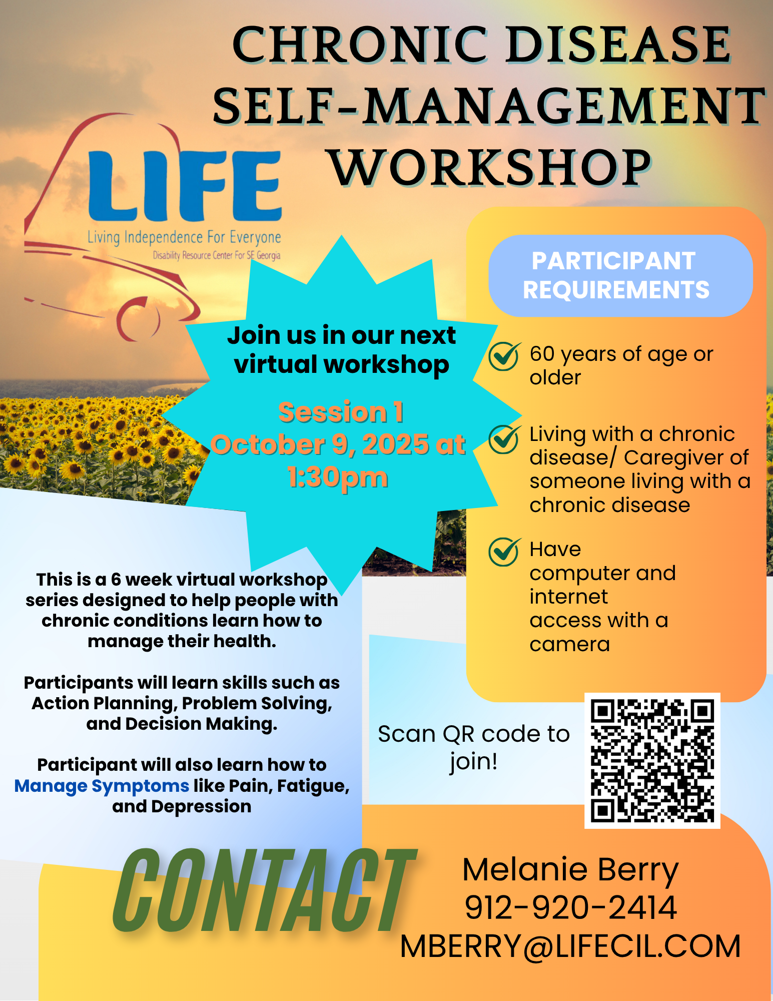 Are you 60 or older and living with a chronic health condition - or caring for someone who is? LIFE, Inc. invites you to join our FREE Chronic Disease Self-Management Program (CDSMP), an evidence-based workshop designed by Stanford University and led by trained facilitators.